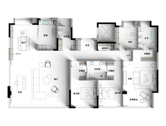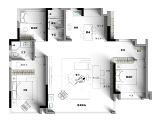 多功能橫廳滿足居者不同的生活需求,將陽臺擴充進來增加進光量,提高空間利用率。廚房改開放式,餐廚一體動線更流暢,互動性也更強。客衛將干區外移,避免使用功能互相干擾。