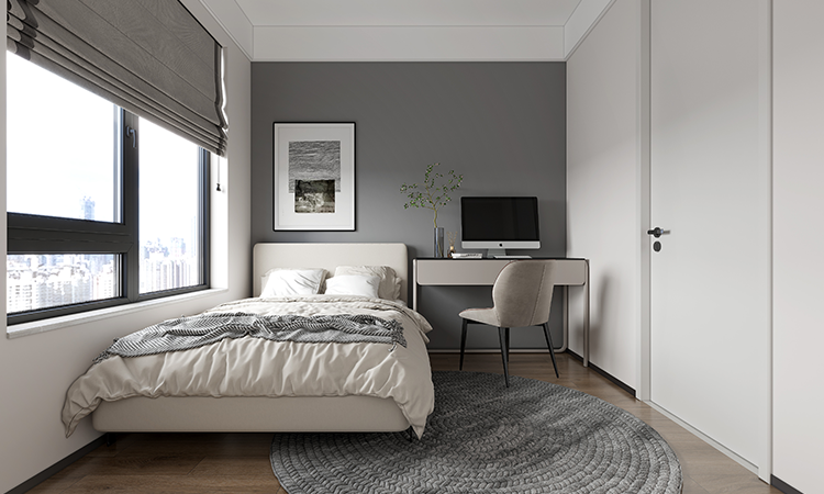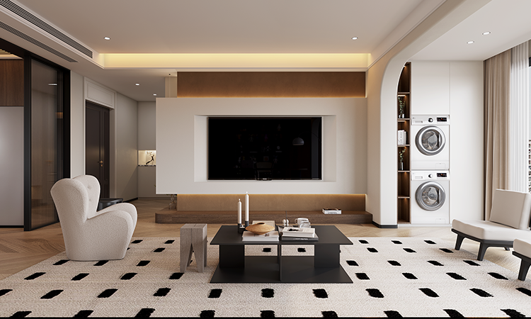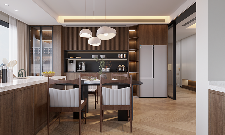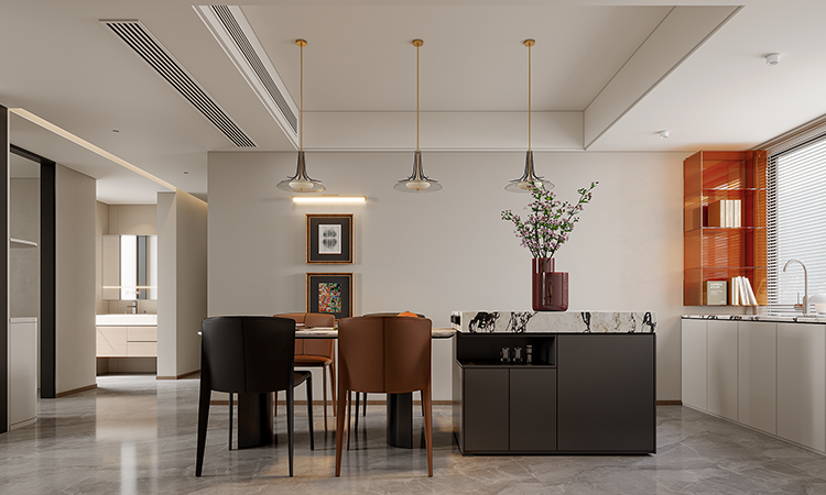 橫廳承重墻無法拆改,改成半開放式書房+客廳布局,增強空間互動性。餐廚合為一體,利用隱藏式玻璃推拉門做半開放設計,實現在獨立與開放間的自由切換。
